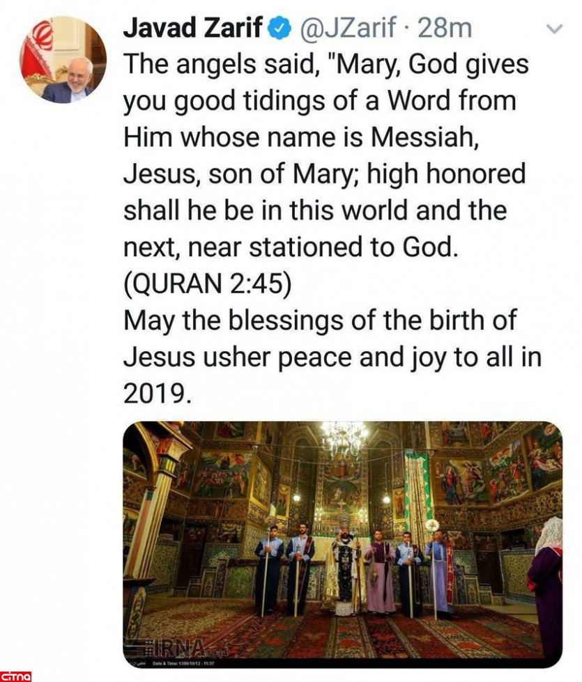 تبریک توئیتری ظریف به مناسبت میلاد مسیح (ع)