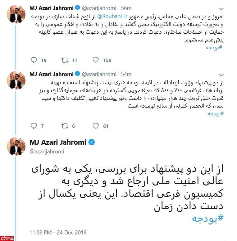به گزارش سیتنا، مهندس آذری جهرمی توئیت کرد:
