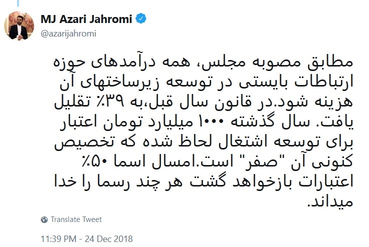 به گزارش سیتنا، مهندس آذری جهرمی توئیت کرد: