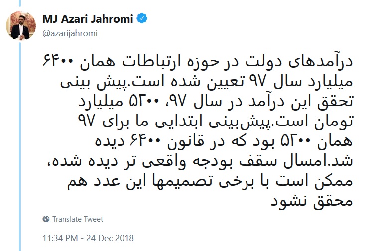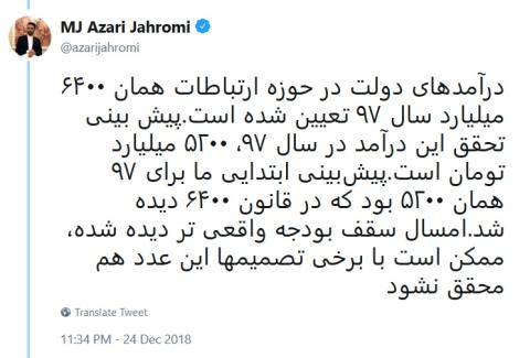 درآمدهای دولت در حوزه ارتباطات همان ۶۴۰۰ میلیارد سال ۹۷ تعیین شده است. پیش بینی تحقق این درآمد در سال ۹۷، ۵۲۰۰ میلیارد تومان است. پیشبینی ابتدایی ما برای ۹۷ همان ۵۲۰۰ بود که در قانون ۶۴۰۰ دیده شد. امسال سقف بودجه واقعی تر دیده شده، ممکن است با برخی تصمیمها این عدد هم محقق نشود.