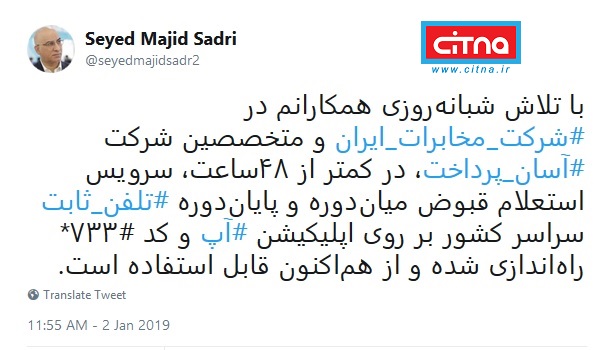 با تلاش شبانهروزی همکارانم در #شرکت_مخابرات_ایران و متخصصین شرکت #آسان_پرداخت، در کمتر از ۴۸ساعت، سرویس استعلام قبوض میاندوره و پایاندوره #تلفن_ثابت سراسر کشور بر روی اپلیکیشن #آپ و کد #۷۳۳* راهاندازی شده و از هماکنون قابل استفاده است.