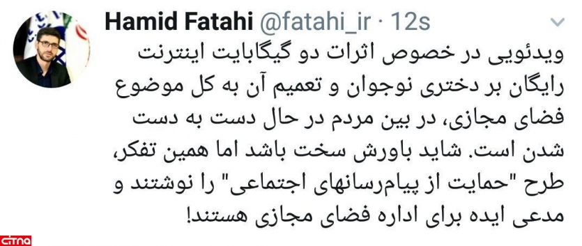 معاون وزیر ارتباطات پیرامون ویدئویی در خصوص اثرات دو گیگابایت اینترنت رایگان بر دختری نوجوان و تعمیم آن به کل موضوع فضای مجازی، توضیح داد: شاید باورش سخت باشد اما همین تفکر، طرح "حمایت از پیامرسانهای اجتماعی" را نوشتند و مدعی ایده برای اداره فضای مجازی هستند!