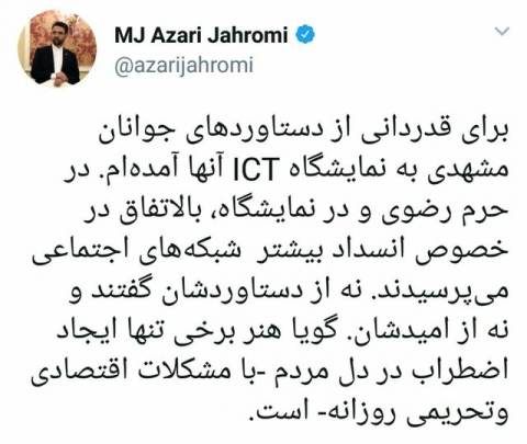 به گزارش سیتنا، در توئیت آذری جهرمی آمده است: برای قدردانی از دستاوردهای جوانان مشهدی به نمایشگاه ICT آنها آمدهام. در حرم رضوی و در نمایشگاه، بالاتفاق در خصوص انسداد بیشتر شبکههای اجتماعی میپرسیدند. نه از دستاوردشان گفتند و نه از امیدشان. گویا هنر برخی تنها ایجاد اضطراب در دل مردم -با مشکلات اقتصادی وتحریمی روزانه- است.