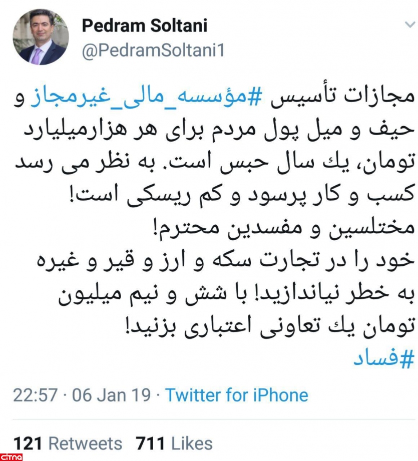 مجازات تأسیس#مؤسسه_مالى_غیرمجاز و حیف و میل پول مردم براى هر هزارمیلیارد تومان، یک سال حبس است. به نظر مى رسد کسب و کار پرسود و کم ریسکى است! مختلسین و مفسدین محترم! خود را در تجارت سکه و ارز و قیر و غیره به خطر نیاندازید! با شش و نیم میلیون تومان یک تعاونى اعتبارى بزنید!