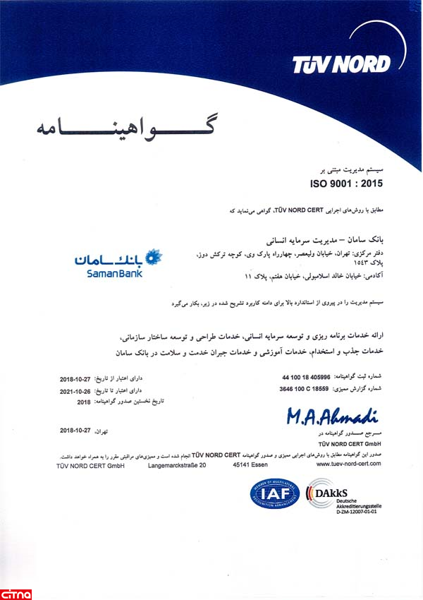 مدیریت سرمایه انسانی بانک سامان گواهینامه نظام مدیریت کیفیت را از شرکت توف نورد آلمان دریافت کرد.