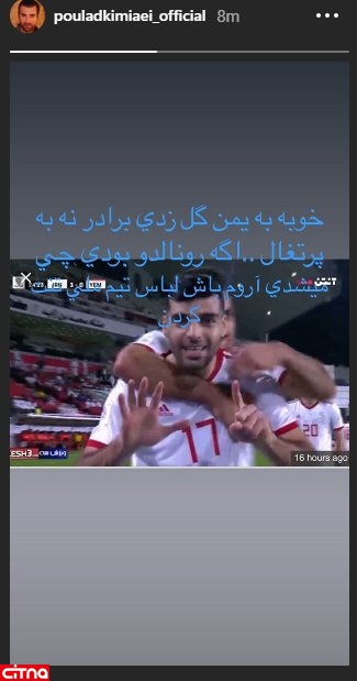 «خوبه به یمن گل زدی برادر نه پرتغال، اگه رونالدو بودی چی می شدی، آروم باش لباس تیم ملی تنت کردن.»