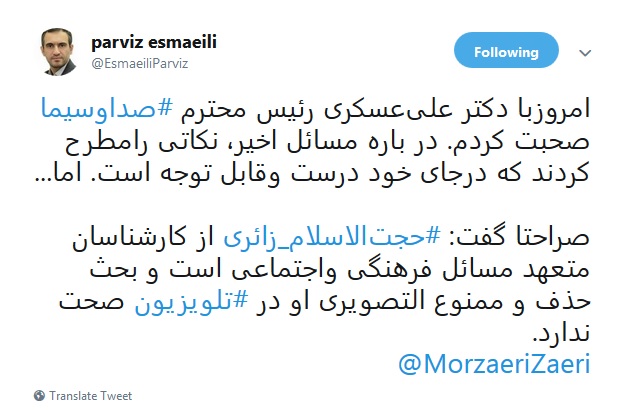 امروزبا دکتر علیعسکری رئیس محترم #صداوسیما صحبت کردم. در باره مسائل اخیر، نکاتی رامطرح کردند که در جای خود درست و قابل توجه است. اما... صراحتا گفت: #حجتالاسلام_زائری از کارشناسان متعهد مسائل فرهنگی و اجتماعی است و بحث حذف و ممنوع التصویری او در #تلویزیون صحت ندارد.
