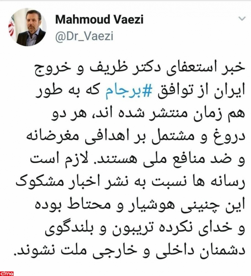 به گزارش سرویس وبگردی سیتنا، محمود واعظی رئیس دفتر رئیس جمهور در توئیتی در واکنش به شایعه استعفای محمدجواد ظریف نوشت: