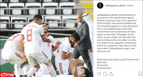 سرمربی تیم ملی ایران با انتشار متنی در اینستاگرام عملکرد بازیکنانش مقابل ویتنام را مورد تحسین قرار داد.