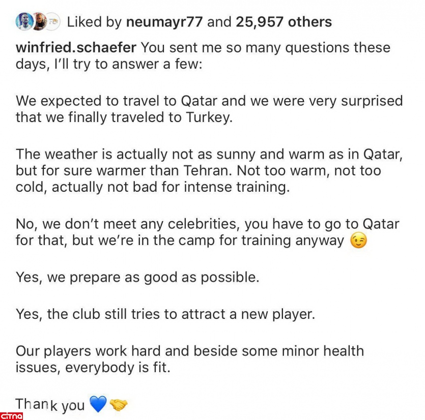او در جدیدترین پست اینستاگرامی خود نوشت: «در چند روز اخیر سوالات بسیاری برای من فرستاده شده است که سعی می کنم به تعدادی از آنها پاسخ دهم. انتظار داشتیم که به قطر سفر کنیم و متعجب شدیم که در نهایت به ترکیه رفتیم. وضعیت هوا به گرمی و آفتابی هوای قطر نیست اما گرم تر از هوای تهران است. نه خیلی گرم و نه خیلی سرد، این هوا برای تمرینات سخت بد نیست. ما با هیچ سلبریتی دیدار نمی کنیم، برای این کار باید به قطر بروید اما ما در کمپ تمرینی خود به سر می بریم. آماده سازی تا جای مطلوب ادامه دارد».