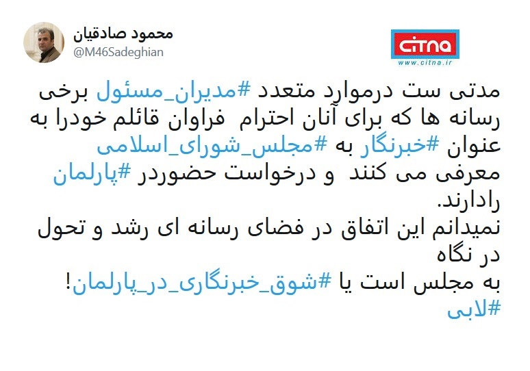 مدتی است در موارد متعدد #مدیران_مسئول برخی رسانه ها که برای آنان احترام فراوان قائلم خود را به عنوان #خبرنگار به #مجلس_شورای_اسلامی معرفی می کنند و درخواست حضور در #پارلمان را دارند.