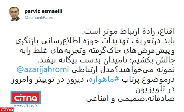 اقناع، زادۀ ارتباط موثر است. باید درتعریف تهدیدات حوزه اطلاع‌رسانی بازنگری وپیش‌فرض‌های خاک‌گرفته و تجربه‌های غلط رابه چالش بکشیم؛ تا میدان بدست بیگانه نیفتد. نمونه می‌خواهید؟ مدل ارتباطی @azarijahromi درموضوع پرتاب #ماهواره، دیروز در توییتر وامروز در تلویزیون صادقانه، صمیمی و اقناعی
