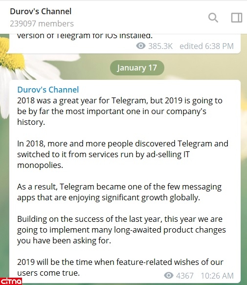 به گزارش سیتنا، پاول دوروف مدیرعامل تلگرام با انتشار پیامی در کانال تلگرامی اش، ضمن برشمردن رشد تعداد کاربران این پیام رسان در سال 2018 و برنامه ریزی برای اعمال تغییرات مدنظر کاربران در تلگرام، برای تحقق آرزویهای مدنظر کاربران در این پیام رسان در سال جاری میلادی ابراز امیدواری کرد.
