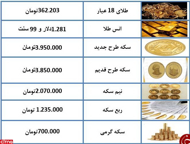 هر گرم طلای ۱۸ عیار هم ۳۶۲ هزار و ۲۰۰ تومان ارزشگذاری شده است، ضمن آنکه هر اونس طلا در بازارهای جهانی با قیمت ۱.۲۹۱ دلار معامله شد.