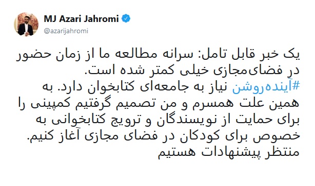 یک خبر قابل تامل: سرانه مطالعه ما از زمان حضور در فضایمجازی خیلی کمتر شده است. #آیندهروشن نیاز به جامعهای کتابخوان دارد. به همین علت همسرم و من تصمیم گرفتیم کمپینی را برای حمایت از نویسندگان و ترویج کتابخوانی به خصوص برای کودکان در فضای مجازی آغاز کنیم. منتظر پیشنهادات هستیم.