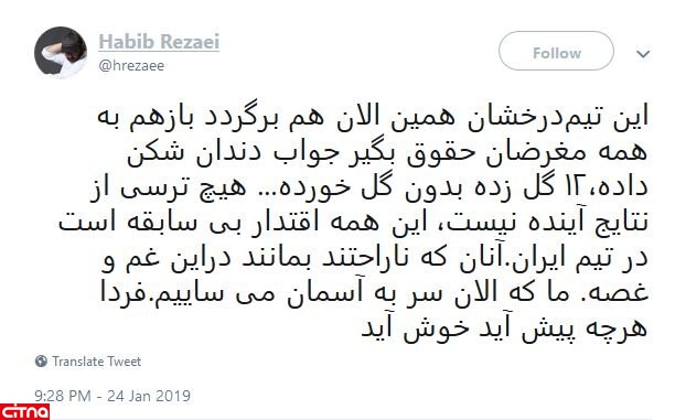 به گزارش سرویس وبگردی سیتنا، حبیب رضایی در توییتر نوشت: