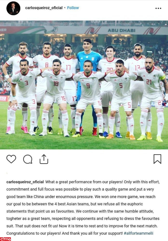 به گزارش سرویس وبگردی سیتنا، تیم ملی ایران روز گذشته با سه گل تیم ملی چین تحت هدایت مارچلو لیپی را شکست داد و توانست با اقتداری مثال زدنی به جمع چهار تیم برتر آسیا راه پیدا کند. یوزها هنوز گلی دریافت نکرده اند و بهترین خط حمله جام هم نام گرفته اند. تیم ملی ایران در پنج رقابتی که در جام ملت های امسال حضور داشته است، دوازده گل درون دروازه حریفان کرده و با مالکیت توپ بازی ها را با نمایش های دیدنی به پایان برده است. کارلوس کیروش، سرمربی تیم ملی ایران به پیروزی مقابل چین که تیم ملی را پس از دو دهه به نیمه نهایی جام ملت ها رساند در اینستاگرام خود واکنش نشان داد. او به ملت ایران تبریک گفت و از بازیکنانش تشکر کرد:
