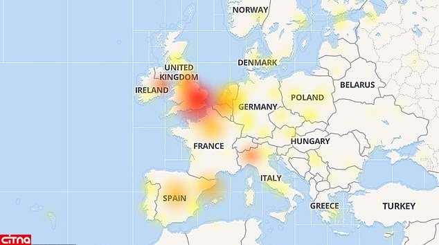 نقشه اختلال در خدمت رسانی جی میل در انگلیس و اروپا در وب سایت «Down Detector»