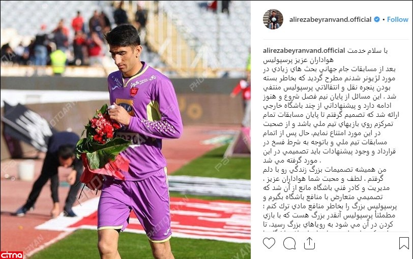 به گزارش سرویس وبگردی سیتنا، علیرضا بیرانوند با انتشار پستی در صفحه اینستاگرامش به شایعات رفتن از پرسپولیس واکنش نشان داد و نوشت: