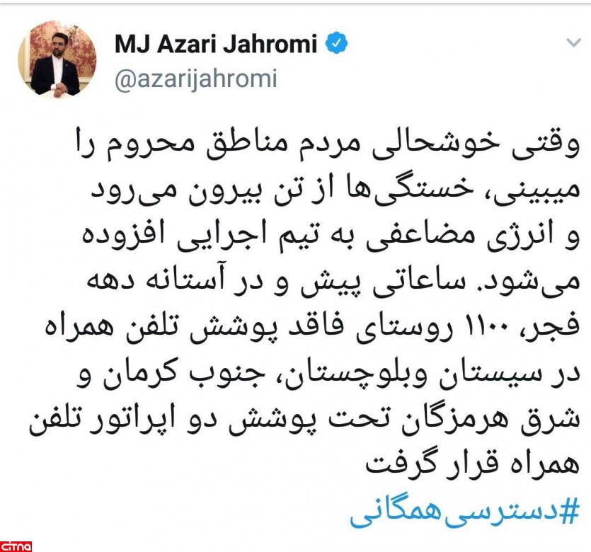 به گزارش سیتنا، مهندس آذری جهرمی توئیت کرد: