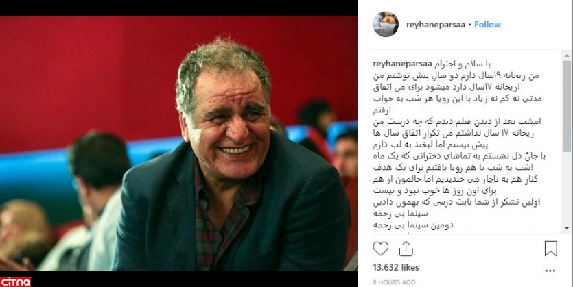 ریحانه پارسا دل نوشتهای را خطاب به رسول صدرعاملی نوشت و از انتخاب نشدنش برای فیلم «سال دوم دانشکده من» قدردانی کرد.