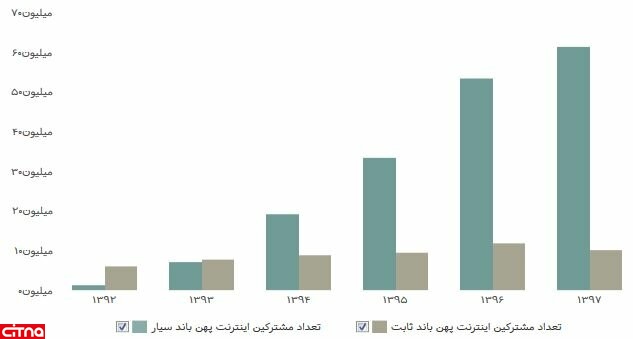 به گزارش سیتنا، تعداد مشترکین اینترنت پهنباند طبق آخرین آمار منتشرشده در سازمان تنظیم مقررات و ارتباطات رادیویی تا پایان شهریورماه سال جاری، ۷۱ میلیون و ۲۴۹ هزار و ۶۰۱ است که شامل ۱۰ میلیون و ۳۵ هزار و ۲۷۲ هزار مشترک اینترنت پهن باند ثابت و ۶۱ میلیون و ۲۱۴ هزار و ۳۲۹ مشترک اینترنت پهنباند سیار میشود.