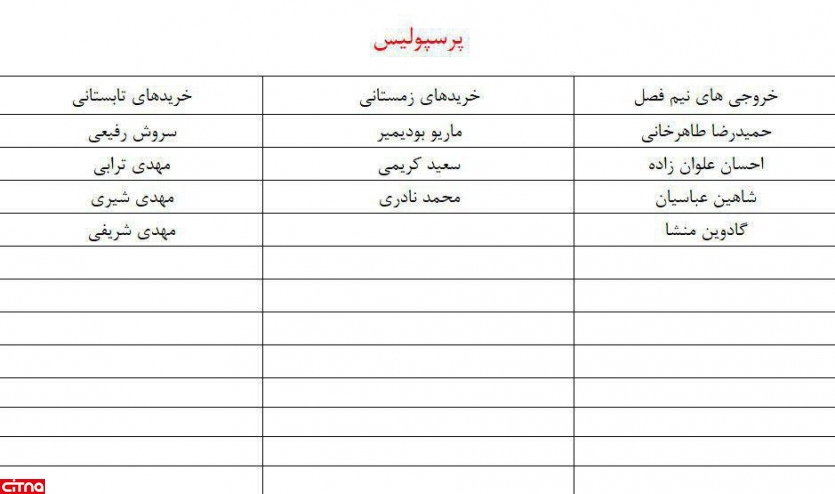 قرمزها در لیست خروجی های خود نیز البته خساست به خرج دادند و بزرگترین جدا شده این تیم گادوین منشا بود که به شکل غیر منتظره ای از لیست کنار گذاشته شد تا جا برای بودیمیر باز شود. طاهرخانی، علوان زاده و عباسیان دیگر جدا شده های تیم برانکو بودند که حالا با اضافه شدن چندین بازیکن جوان تر غیبت آنها احساس نخواهد شد.