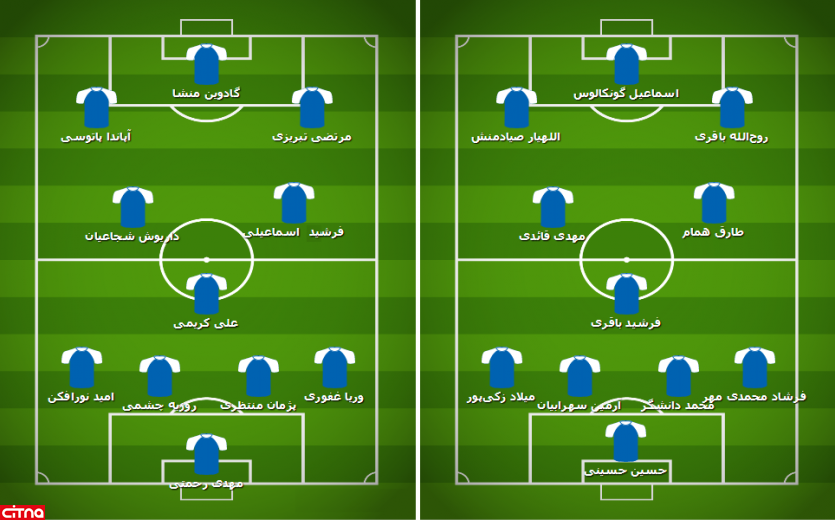 آبی پوشان حسینی و رحمتی را به عنوان گلر، زکی پور و نور افکن را به عنوان دفاع چپ، منتظری، چشمی، سهرابیان و دانشگر را به عنوان مدافع میانی، وریا غفوری و فرشاد محمدی مهر را به عنوان دفاع راست. علی کریمی و فرشید باقری در هافبک دفاعی، طاق همام، مهدی قائدی، فرشید اسماعیلی و داریوش شجاعیان به عنوان هافبکهای هجومی، باقری، تبریزی، صیادمنش و پاتوسی به عنوان مهاجمان کناری و در نهایت کونگالوس و منشا به عنوان مهاجم نوک در اختیار دارد که نشان میدهد دو تیم کامل و پرمهره در اختیار شفر قرار دارد.