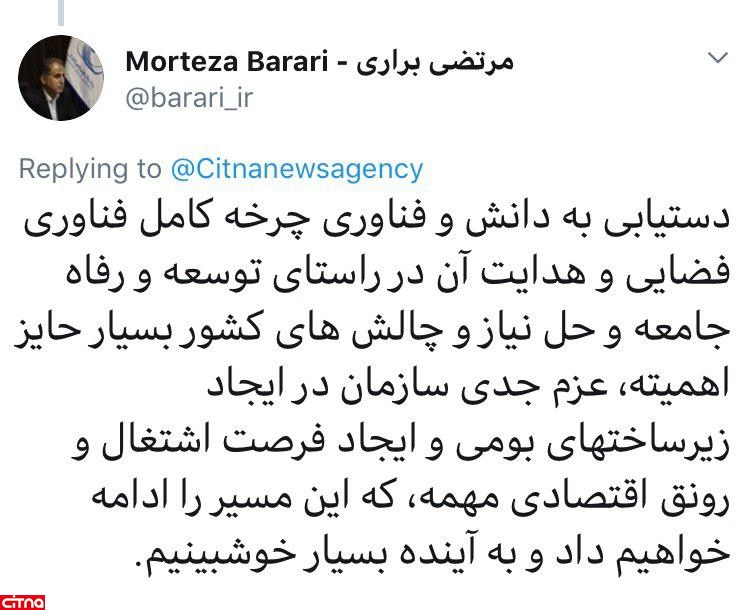 به گزارش سیتنا، در پی انتشار گفتوگوی دکتر براری در صفحهی توئیتر سیتنا، پیرامون اقدامات سازمان فضایی در ساخت و پرتاب ماهواره، رئیس سازمان فضایی ایران توئیت کرد: