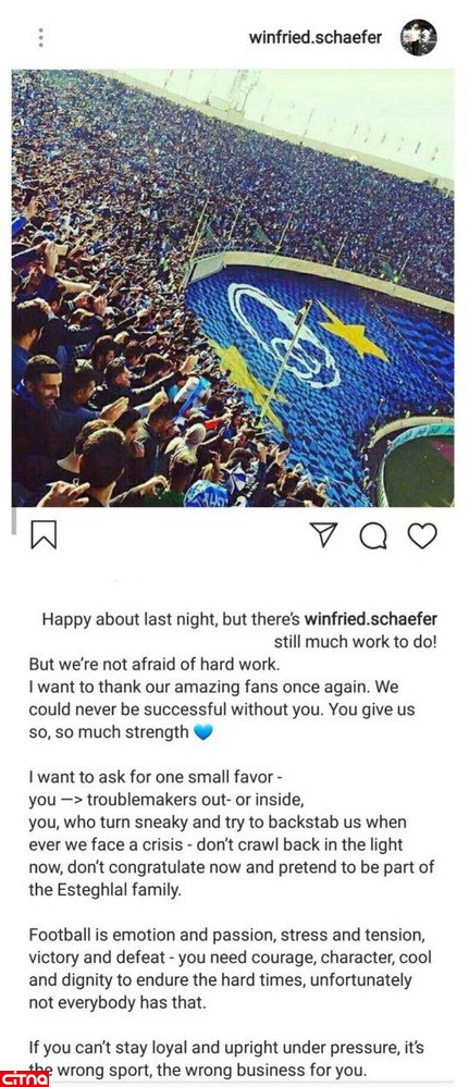 به گزارش سرویس وبگردی سیتنا، استقلال موفق شد در اولین بازی دور برگشت لیگ برتر با 4 گل پیکان را شکست دهد. وینفرد شفر که از چند استقلالی ناراحت است در اینستاگرامش نوشت: