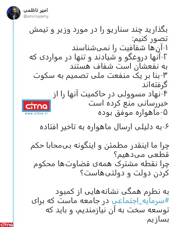 دکتر ناظمی با طرح شش سناریو در مورد وزیر و تیمش؛ چرا نقطه مشترک همهی قضاوتها محکوم کردن دولت و دولتیهاست؟/ همگی نشانههایی از کمبود سرمایه اجتماعی در جامعه ماست