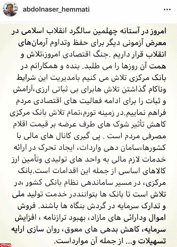 به گزارش سیتنا، عبدالناصر همتی در صفحه شخصی خود در فضای مجازی نوشت: امروز در آستانه چهلمین سالگرد انقلاب اسلامی در معرض آزمونی دیگر برای حفظ و تداوم آرمان های انقلاب قرار داریم. جنگ اقتصادی امروز، تلاش و همت آن روزها را می طلبد.
