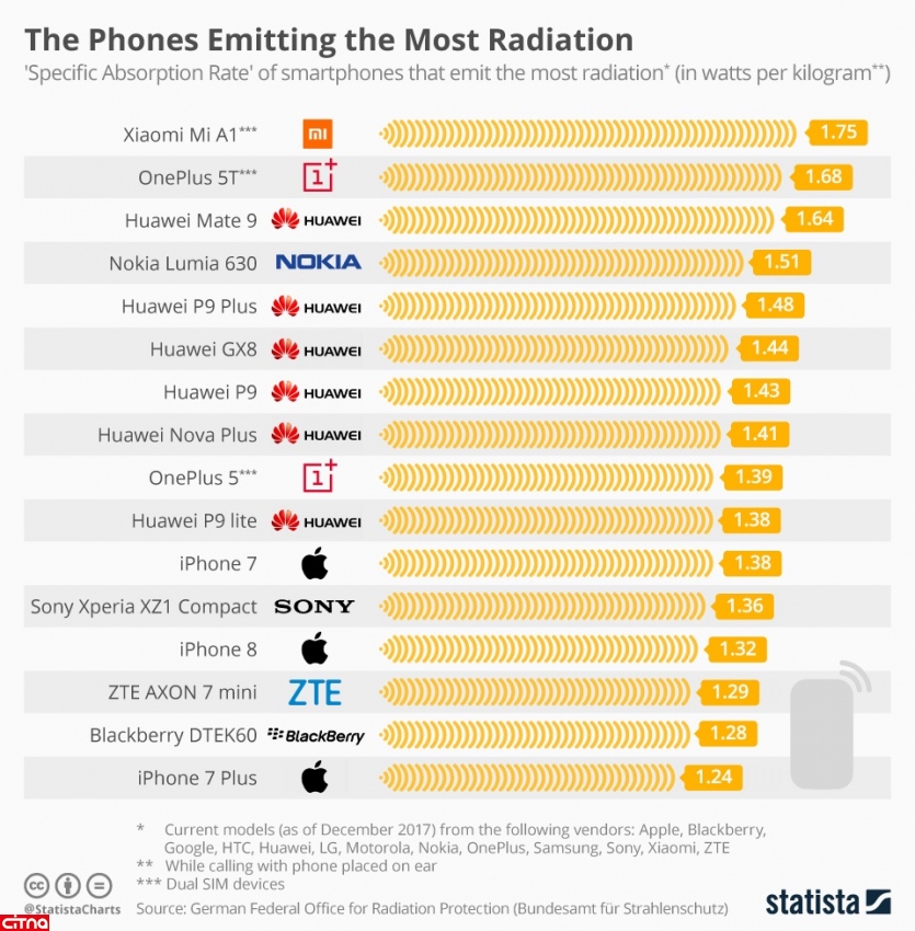 بر طبق آنچه در لیستی انتشار یافته از سوی سازمان آلمانی دیده میشود گوشی Mi A1 از شرکت چینی Xiaomi در صدر تشعشعزاترین گوشیهای هوشمند قرار دارد. به طور کلی 9 مورد در این لیست به تلفنهای همراه ساخت شرکتهای چینی اختصاص یافته است که برای سازندگان این گوشیها و خریداران این دستگاهها نوعی فاجعه محسوب میشود.