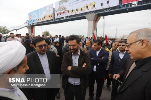 در تصویر آذری جهرمی، وزیر ارتباطات و فناوری اطلاعات در راهپیمایی ۲۲ بهمن در بندرعباس را میبینید.