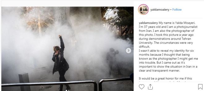 یلدا معیری، عکاس این عکس به زبان فارسی و انگلیسی در اینستاگرام نوشته: این عکس را یک سال پیش در روز ٩ دی ماه در جریان اعتراضات مردمی در دانشگاه تهران گرفتم و بخاطر ملاحظاتی، هویت عکاس را مخفی نگاه داشتم.