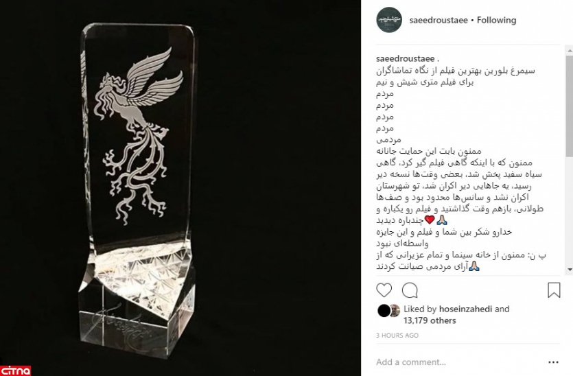 به گزارش سرویس وبگردی سیتنا، سعید روستایی، کارگردان فیلم سینمایی «متری شیش و نیم»، پس از آنکه سیمرغ بلورین بهترین فیلم از نگاه مردم را از سی و هفتمین جشنواره فیلم فجر دریافت کرد، در اینستاگرام نوشت: