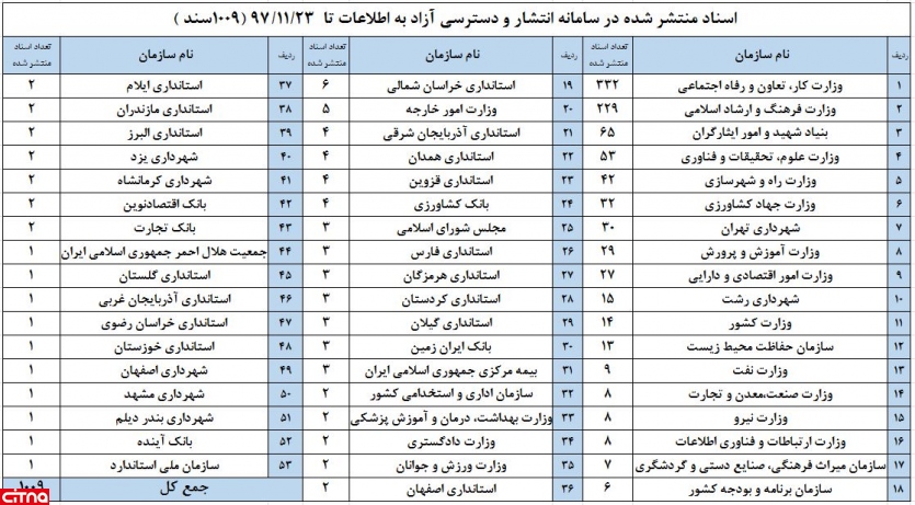 مستندات منتشره عمدتا شامل مصوبات، قراردادها، اطلاعات آماری، گزارش عملکرد، نامه ها و مکاتبات و .... می باشد که از سوی ۵٣ دستگاه در اختیار عموم قرار گرفته است.
