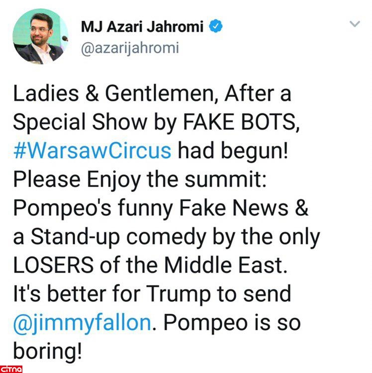 وزیر ارتباطات و فناوری اطلاعات، گفت: پس از نمایش ویژه باتهای جعلی، سیرک ورشو آغاز شد. لطفاً از این اجلاس لذت ببرید: اخبار جعلی خندهدار پمپئو و استندآپکمدی توسط تنها بازندگان خاورمیانه.