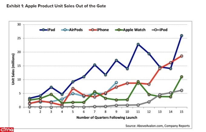 در حال حاضر پیشبینی میشود که این رقم چشمگیر در سال جاری به بیش از ۵۰ میلیون نفر برسد چراکه اپل قصد دارد تا سال ۲۰۱۹ تقریباً ۴۰ میلیون دستگاه دیگر به فروش برساند. شاید مهمترین نکته این است که این آنالیزور معتقد است ایرپاد دومین محصول موفقیت اپل است که به خارج از کشور صادر شده است. این حرف او به این معنی است که حمل و نقل جهانی ایرپادها از اواخر سال ۲۰۱۶ ممکن است روی فروش اولیه آیفون و ساعت هوشمند تاثیر گذاشته باشد.