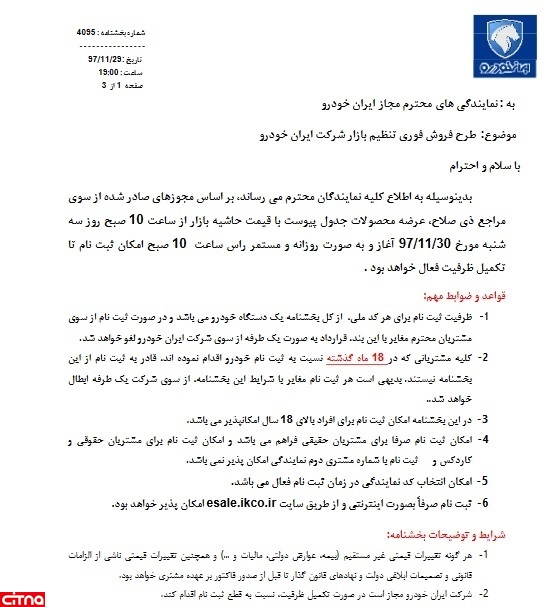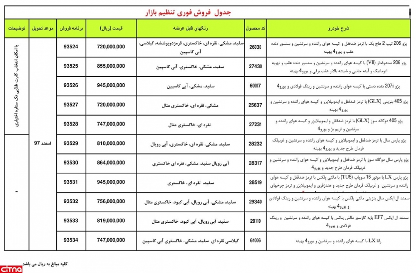 به گزارش سیتنا، در این شرایط فروش خودروهای پژو 405 ، پژو 207، پژو پارس، سمند، رانا و پژو 206 تیپ 2 و وی 8 عرضه خواهد شد و این محصولات تا پیش از آغاز سال ٩٨ به مشتریان تحویل داده میشوند.