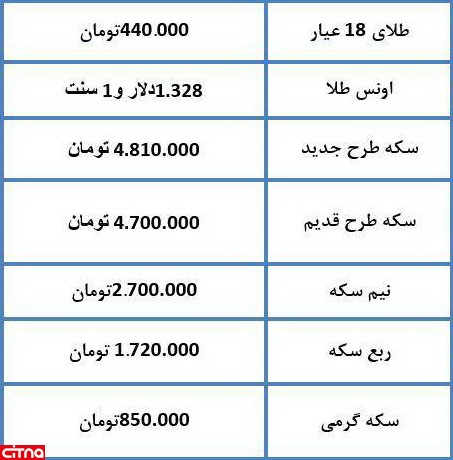 قیمت هر گرم طلای ۱۸ عیار در بازار آزاد به ۴۴۰ هزار تومان رسید و هر اونس طلا در بازارهای جهانی با قیمت ۱۳۲۸ دلار و یک سنت معامله شد.