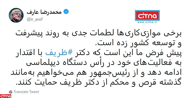 دکتر محمد رضا عارف، عضو مجمع تشخیص مصلحت نظام و نمایندهی مردم تهران در مجلس شورای اسلامی، تاکید کرد: پیش فرض ما این است که دکتر ظریف با اقتدار به فعالیتهای خود در رأس دستگاه دیپلماسی ادامه دهد و از رئیسجمهور هم میخواهیم بهمانند گذشته قرص و محکم از دکتر ظریف حمایت کنند.