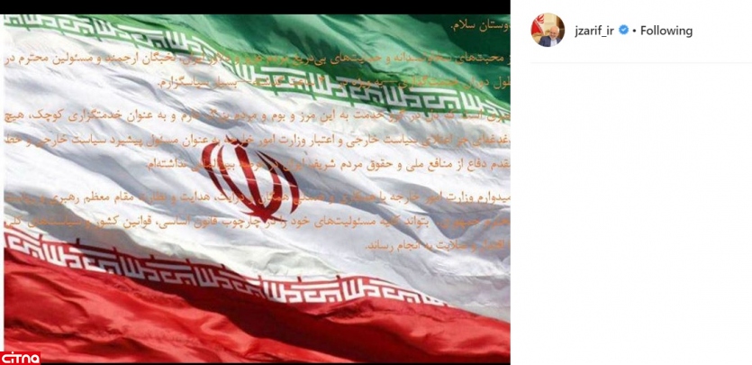 به گزارش سیتنا، محمدجواد ظریف وزیر امور خارجه کشورمان پس از نامه رئیس جمهور و مخالفت با استعفایش با انتشار عکسی در اینستاگرام خود به آن واکنش نشان داد.