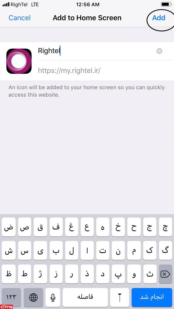 - گزینه Add to home screen را انتخاب کنید و سپس گزینه Add را بزنید.