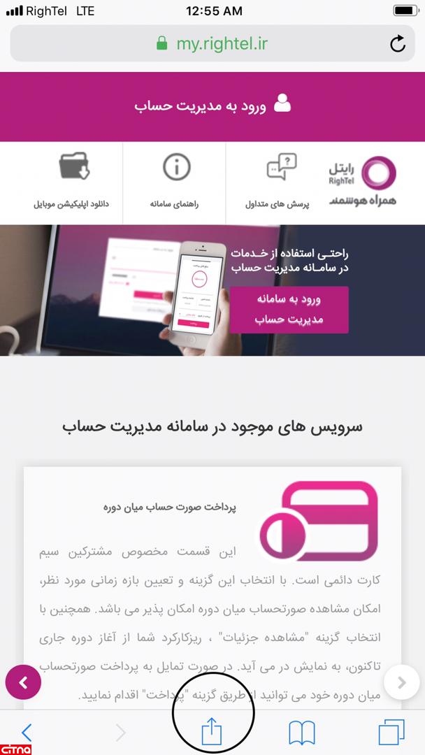 - در مرورگر سافاری تلفن همراه خود بعنوان نمونه my.rightel.ir و یا tv.rightel.ir را باز کنید.