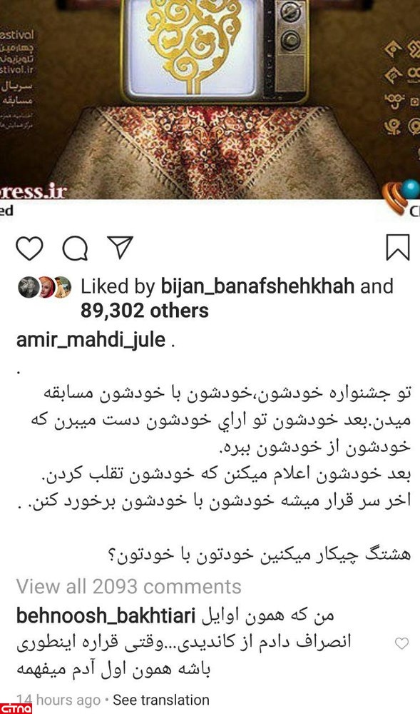 در پاسخی جالب توجه به همین نوشته اینستاگرامی بهنوش بختیاری نوشت: «من که همون اوایل انصراف دادم. وقتی قراره اینطوری باشه همون اول آدم میفهمه.»
