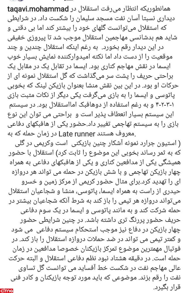 به گزارش سرویس وبگردی سیتنا، محمد تقوی کارشناس فوتبال ایران و پیشکسوت باشگاه استقلال با انتشار متنی در صفحه اینستاگرامش به تحلیل برد استقلال مقابل نفت مسجدسلیمان در لیگ برتر پرداخت.