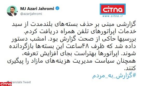 وزیر ارتباطات و فناوری اطلاعات، گفت: گزارشی مبنی بر حذف بستههای بلندمدت از سبد خدمات اپراتورهای تلفن همراه دریافت کردم. بررسیها حاکی از صحت گزارش بود. امشب دستور داده شد که ظرف ۴۸ساعت این بستهها بازگردانده شوند.