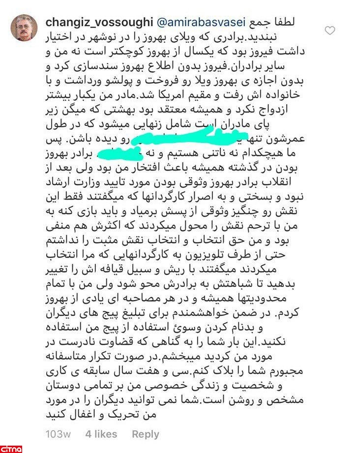 چنگیز در ۲۴ ساعت گذشته دو متن برای برادرش نوشته تا شاید کمی پست اینستاگرامی برادرش تلطیف شود اما انتقادهای زیادی در کامنتها به او شده است. چنگیز البته در قالب خاطره ای از مادرش گفته مادر پیرشان وقتی شنید که بهروز گفته دیگر هیچ وقت به ایران نمیآید، امیدش ناامید شد و دو ماه بعد از آن اتفاق درگذشت.