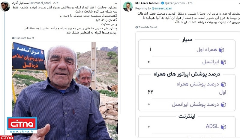 به گزارش سیتنا، اسماعیل آذری، طلبه مشهوری که در روستاها برای بچه ها کتاب قصه می خواند، در جدیدترین توئیت خود با اشاره به روستای دره کل از توابع استان کهکلویه و بویراحمد و به نقل از یک پیرمرد ساکن این روستا نوشت: «عملکرد روحانیت را نقد کرد، از اینکه روستا تلفن همراه آنتن نمی ده، گیرنده هاشون فقط سه شبکه می گیره شکایت کرد.